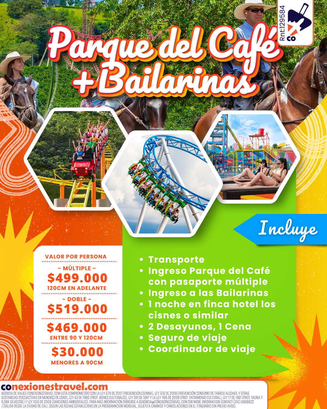 🚍 Transporte ida y regreso 🍽 2 Desayunos 🍛 1 Almuerzo 🎟 Ingreso al parque del café 🎟 Ingreso al parque las bailarinas 🏘 1 noche en finca hotel ☕ 1 cena 🩺 Asistencia medica 🚶🏼 Coordinador de viaje   🚩Punto inicio del recorrido🚩 ▶Parque de las banderas Hora 3:30 am ▶Centro comercial colon plaza Hora 4:00 am ▶Palmira metro versalles Hora 4:30 am ▶ Cerrito Bomba terpel naranjal Hora 5:00am ▶ Buga Bomba puente palo blanco Hora 5:30 am ▶Tulua clinica maria angel Hora 6:00 am   🔎Recomendaciones🔎 🕶 Gafas de sol 🧴 Protección solar 👟 Zapatos cómodos ☂