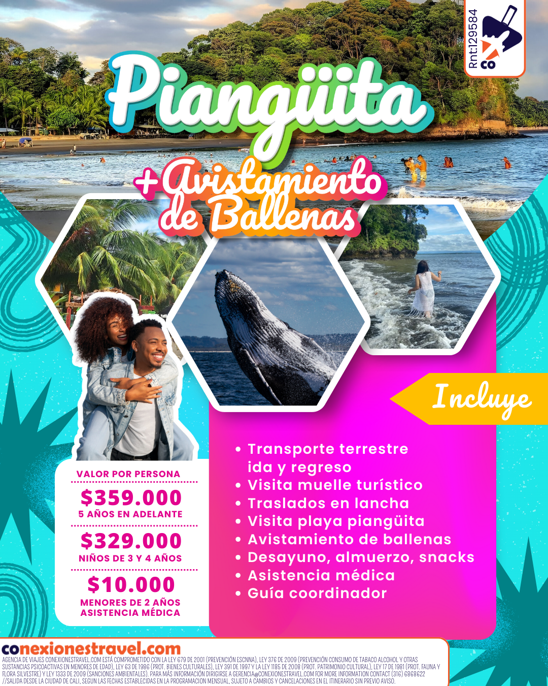 🚍 Transporte ida y regreso 🍽 Desayuno 🍛 Almuerzo 🥐 Refrigerio 🚤 Traslado en lancha b/tura – pianguita -b/tura 🐋 Avistamiento ballenas 🏖 Tarde de playa en pianguita 🩺 Asistencia medica 🚶🏼 Coordinador de viaje   🚩Punto inicio del recorrido🚩   ▶Parque de las banderas Hora 3:30 am ▶Centro comercial colon plaza Hora 4:00 am ▶Palmira metro versalles Hora 4:30 am ▶ Cerrito Bomba terpel naranjal Hora 5:00 am ▶ Buga Bomba puente palo blanco Hora 5:30 am ▶Tulua clinica maria angel Hora 6:00 am   🔎Recomendaciones🔎   🕶 Gafas de sol 🧴 Protección solar 👟 Zapatos cómodos ☂ Sombrilla